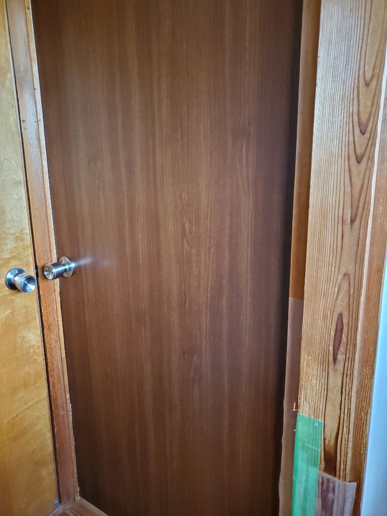金沢屋 大洗・鹿嶋店の大金です。内装リフォームでフラッシュドアを作りました。猫に引っ掻かれてボロボロだったので新しくしたいとのことでした。板の色は家具にあわせて濃いめをご希望でした。どうもありがとうございました。