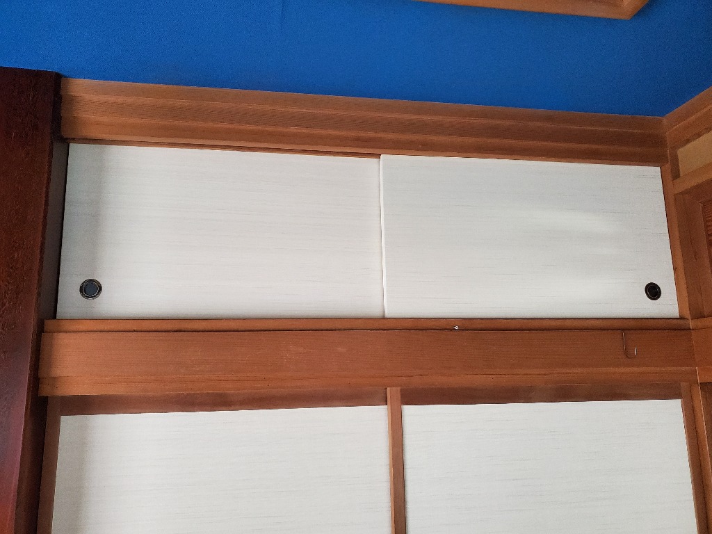 金沢屋 大洗・鹿嶋店の大金です。内装リフォームの襖の張り替えです。無地のものに、引手のデザインを選んでコーデしました。天袋がボウズ襖でした。ボウズでもキレイに仕上がりました。どうもありがとうございました。