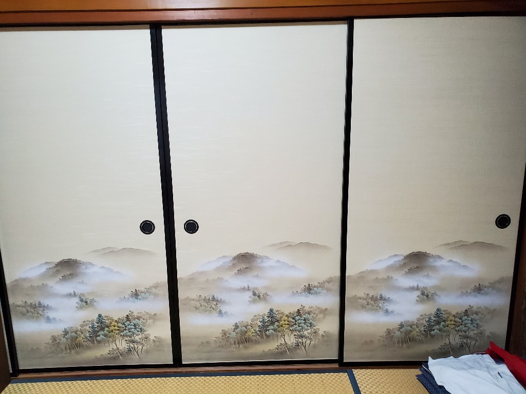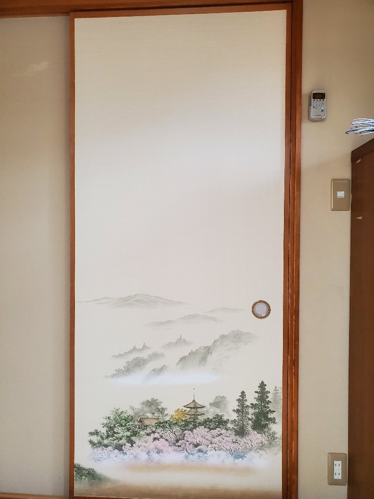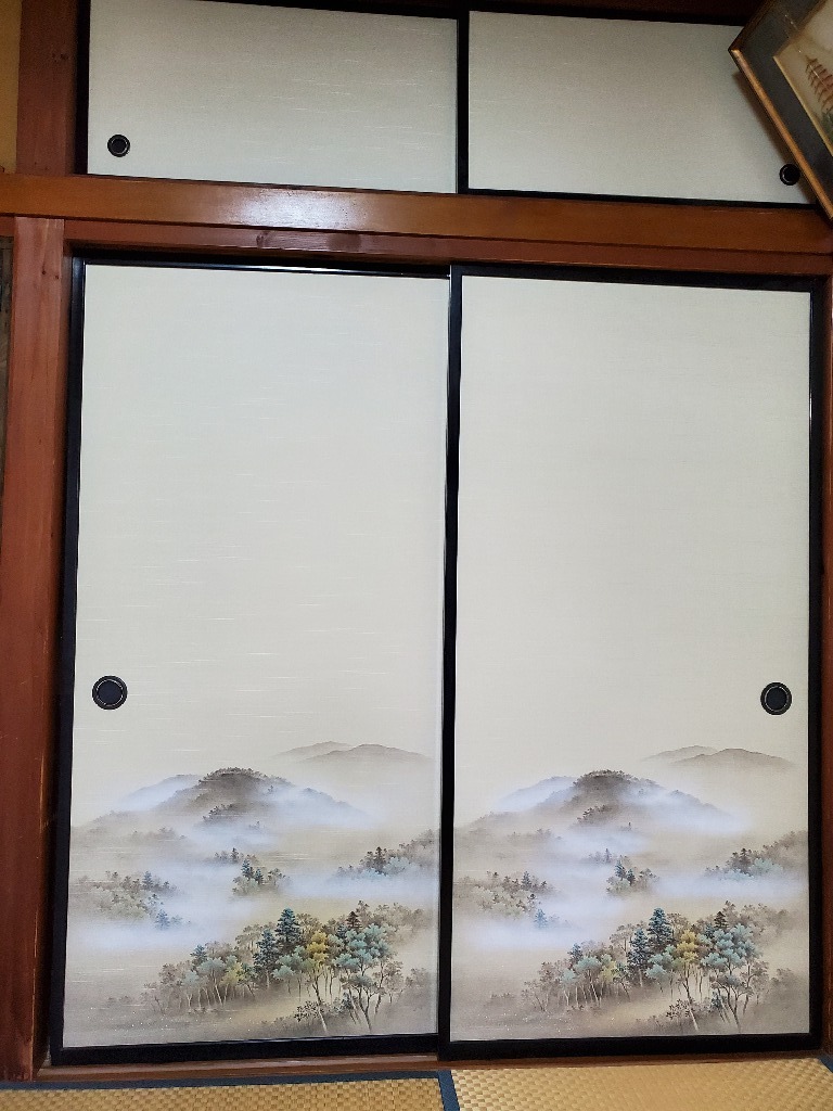 金沢屋 大洗・鹿嶋店の大金です。襖を張り替えてきました。和室に洗濯物を干すので襖が湿気でシミが出ており、はやく張り替えたかったそうです。「里の春」というタイトルの風景画ですね。すごく喜ばれました。やっぱり喜ばれると気持ちがいいですね。